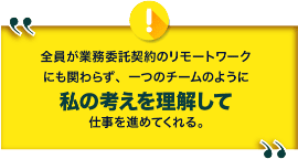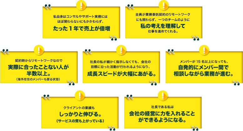 そこで、私は「会社の仕組み化、組織化」のメソッドを活用して、業務委託の方々を自社メンバーのように動いてもらえる仕組みを作りました。業務委託の方が複数になった場合は、業務委託のメンバー同士でコミュニケーションを取って、チームとして私がいなくても協力して動いてくれる状況を作ることが出来ました。