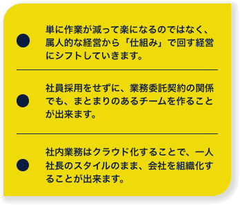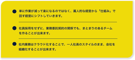 このメソッドの秘訣は「一人社長ならではの仕組み化」と「雇用せずに一致したチーム」を作る点です。